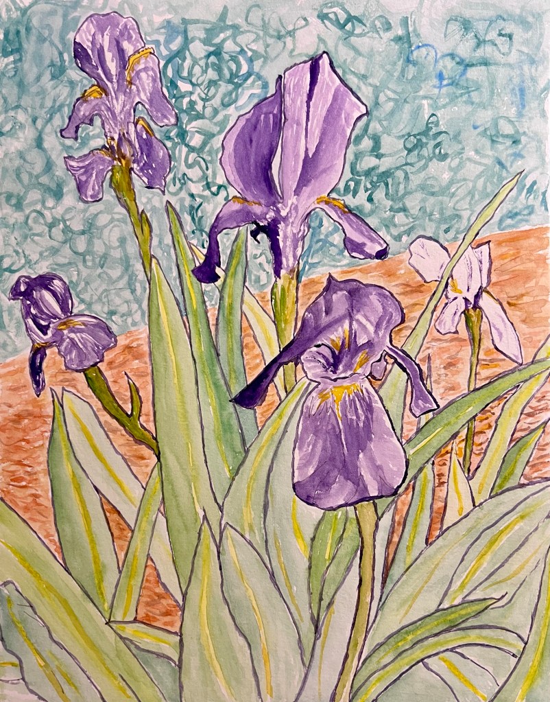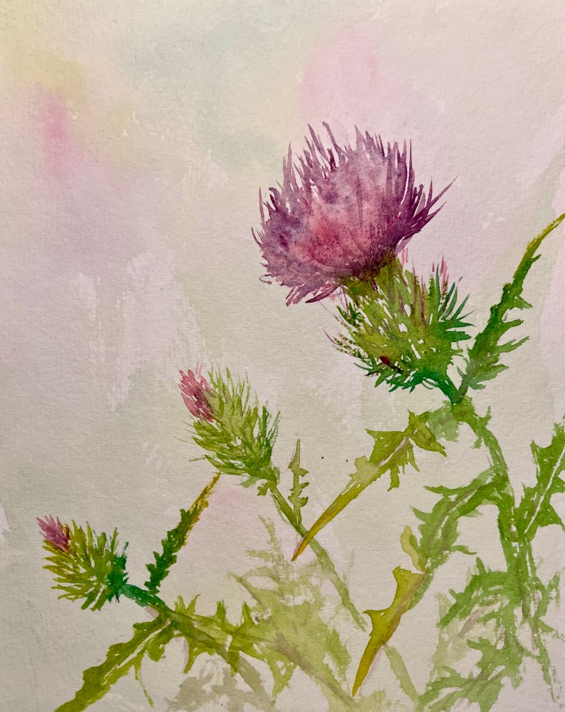 I have two pieces in this show, both purple flowers! I didn’t realize that until I was packing them up to bring to intake earlier this week. But at least, style wise, they are very different from each other. I made the iris painting for the my masterpiece show which is closing at the GPAA tomorrow. It didn’t get in, although two of my other pieces did. The thistles I painted during a Zoom with June from a photo I took at our clubs paint-out at the Ford Estate. Since it was 100% club inspired it was a natural choice for this show.