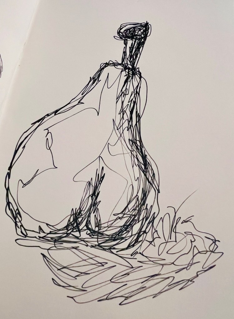 Today I only had time for a quick pear sketch in my sketchbook, because an idea popped into my brain this morning and I’ve been trying to write down as many ideas as I have before it starts to fade. I don’t necessarily want to work on this project now, since I have an idea for a play that I’m itching to write. But maybe after that I’ll go back and read all my notes for this and either run with it, or just wonder what I was thinking. It could go either way.