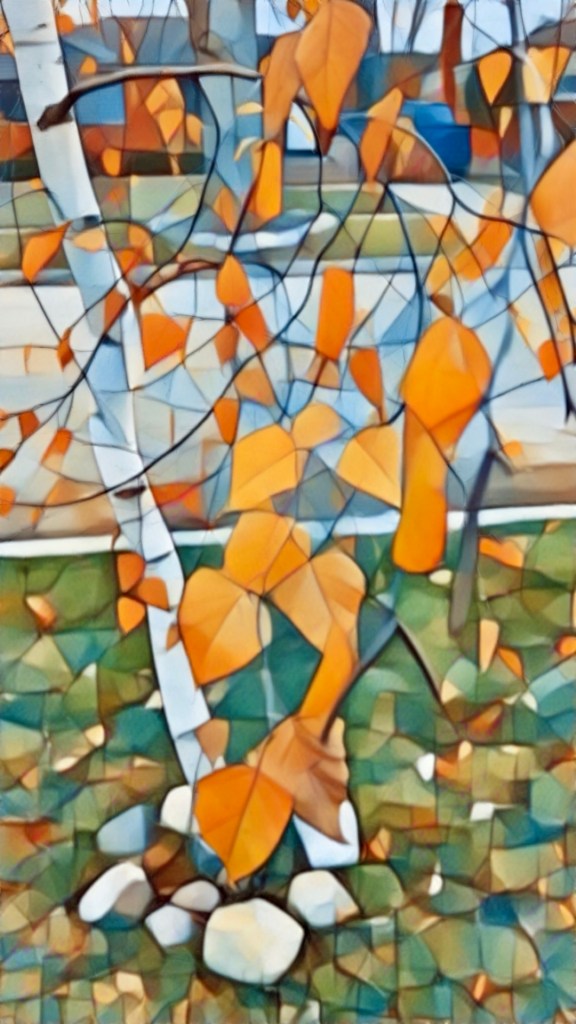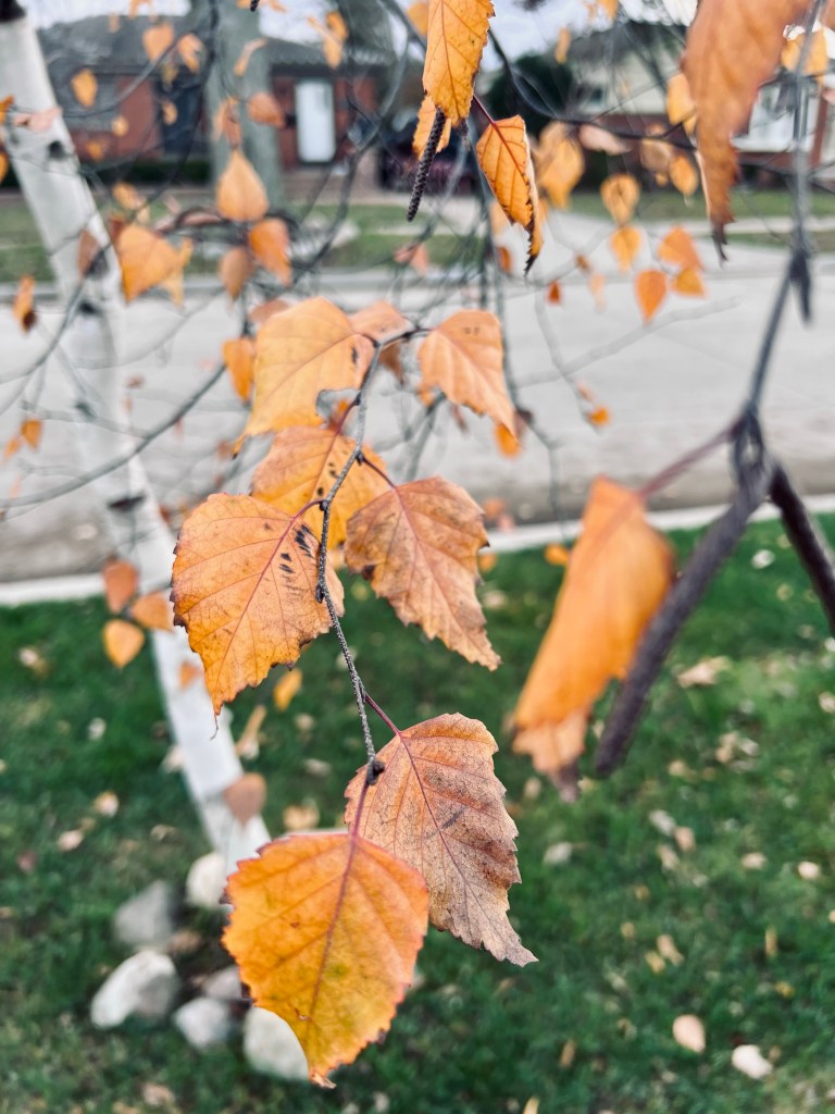 Later on the way home from the bus stop this afternoon, I stopped to take pictures of this small birch tree on our route. I liked the way the orange leaves caught the afternoon light.
