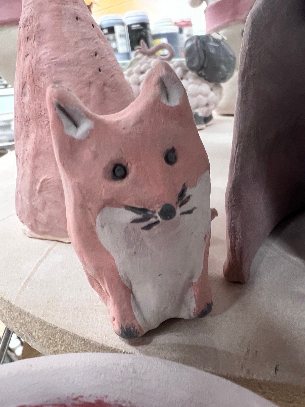 Today was a glazy day for me at the pottery studio. I had quite the accumulation of bisqued pieces ready to glaze. I loved how my little fox turned out. I also glazed three more nesting nativities, and a bunch of cat ornaments. My bells were ready to glaze as well. Both sound nice, but will sound even better when fully fired.