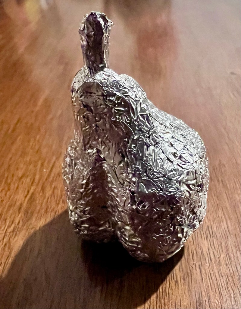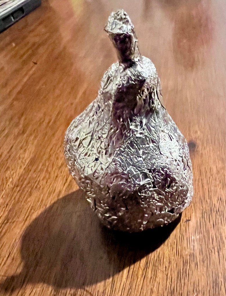 As I often do when trying out a new technique, I decided to use a pear for inspiration. I think it is easily recognizable as a pear, and I think I’ll try out this technique on some other subjects. For this first attempt I used fresh aluminum foil, but I can see reusing cleaned foil from cooking as a way to recycle and reuse waste that may otherwise end up in a landfill.