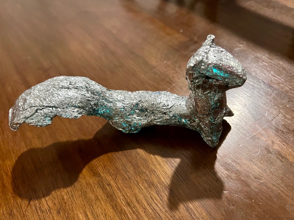 It is a little more challenging to sculpt something so cylindrical with a single sheet of foil. In the demo I watched the woman hot glued pieces together, but I didn’t have a glue gun handy so I just got creative while folding up my squirrel shape. Pulling out and defining the small appendages was the most difficult aspect for me. I am happy that it’s recognizable as a squirrel and I take that as a win.