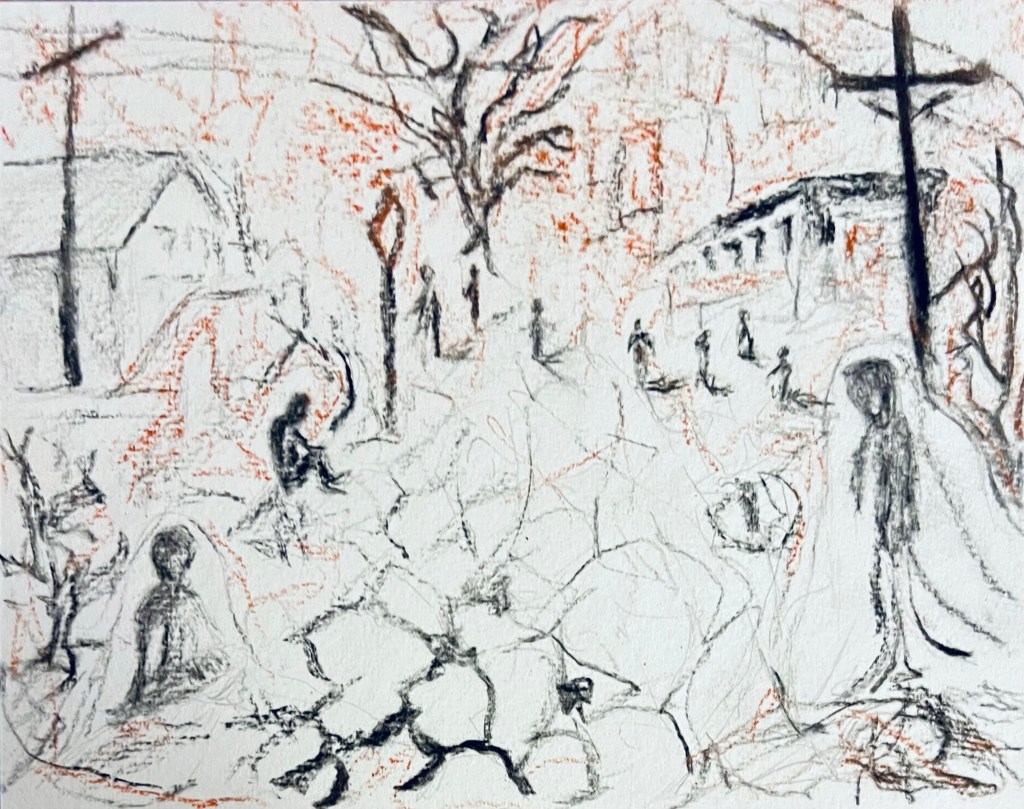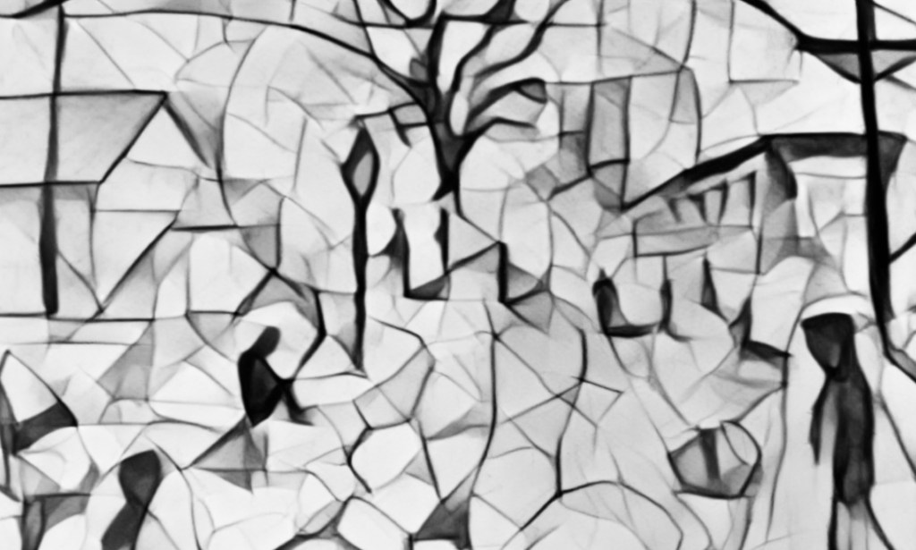 Today I worked on some ideas for artwork inspired by my friend’s poetry. As part of his birthday present I offered to make some art to go with his writing and he was very excited by the idea. He sent me the first poem last night so I was able to sleep on it and come up with some ideas. His poetry has a lot of visual imagery that lends itself well to artistic interpretation. After some pencil sketches, I used Charcoal and sanguine sketch sticks to create my interpretation of his vision. I then ran that through the filtered light algorithm and I like how that turned out as well. It looks really good in black and white too.