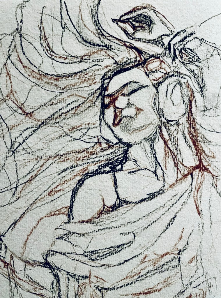 Tonight I had the idea to draw a woman dancing to the music in her headphones. This is roughly based on my daughter, but as she is up north with friends I couldn’t have her pose for me so I used my imagination a bit. I used the Derwent tinted charcoal pencils that came in the January Sketchbox that was delivered today. I really wanted to capture the energy of the music and I think it worked very close to what I imagined- but what truly impressed me was when I digitized it using my filtered light protocol. It was almost exactly what I had envisioned when starting out.