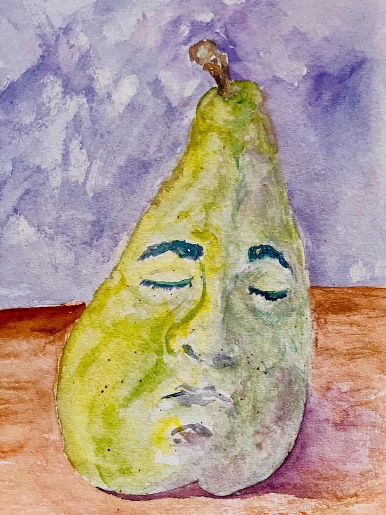 This month’s inspirational theme for my art club is self-portraits, so for this morning’s Zoom with June I played around with some silly versions of a self portrait. The first was myself as a sleepy pear. I have really been loving sculpting these in clay at the studio, so it was the first thing to pop into my mind.
