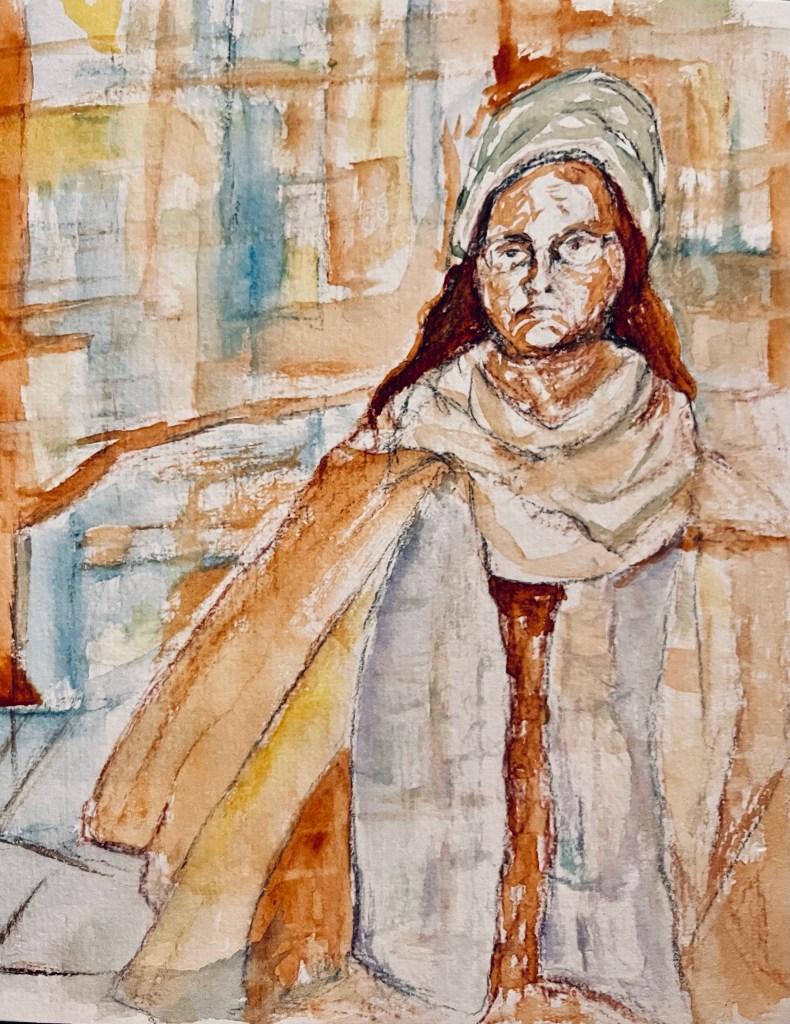 Since I still had plenty of time in the zoom after finishing the pear portrait, I tried a winter inspired self portrait. I took a selfie to get my facial expressions and only after I had painted in the mouth did I realize my expression is so bad. I am always concentrating on getting my head centered that I forget to smile. Lol.