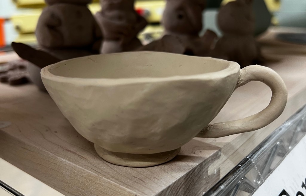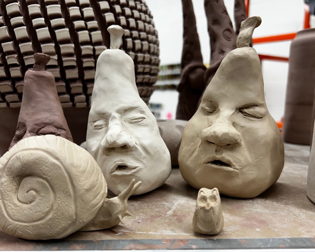 I picked up dinner from the gluten free Colombian restaurant that is in the area of the music class. It was so amazing- I wolfed my portion down before heading to the pottery studio. I started off making a new pear person. then using the clay I scooped out from the pear I was able to sculpt a snail, a petit tea cup, and a tiny owl figurine.