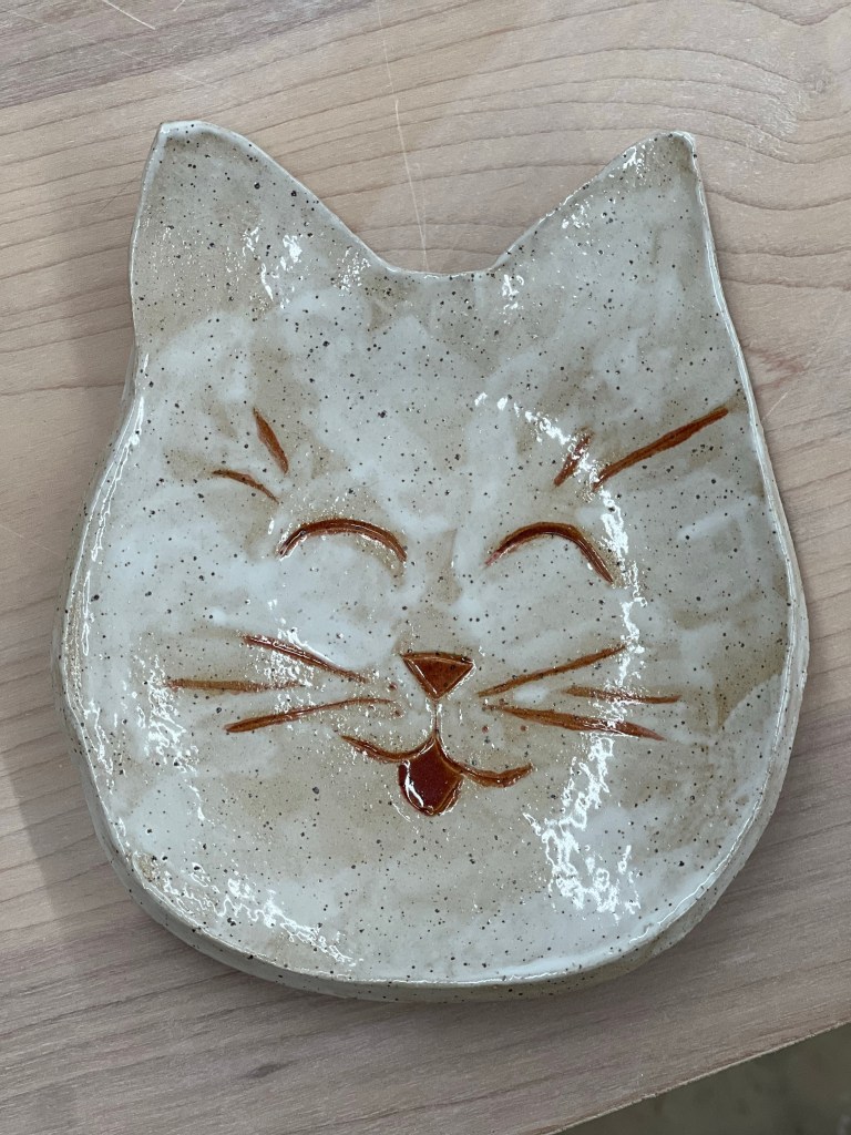 I also had a kitty dish, a small bowl, an ugly face vase and a snail finished. Then it was back to more glazing. I glazed all the evening and worked through my backlog of bisqued pieces, so I’ll be ready to get back to sculpting next visit.