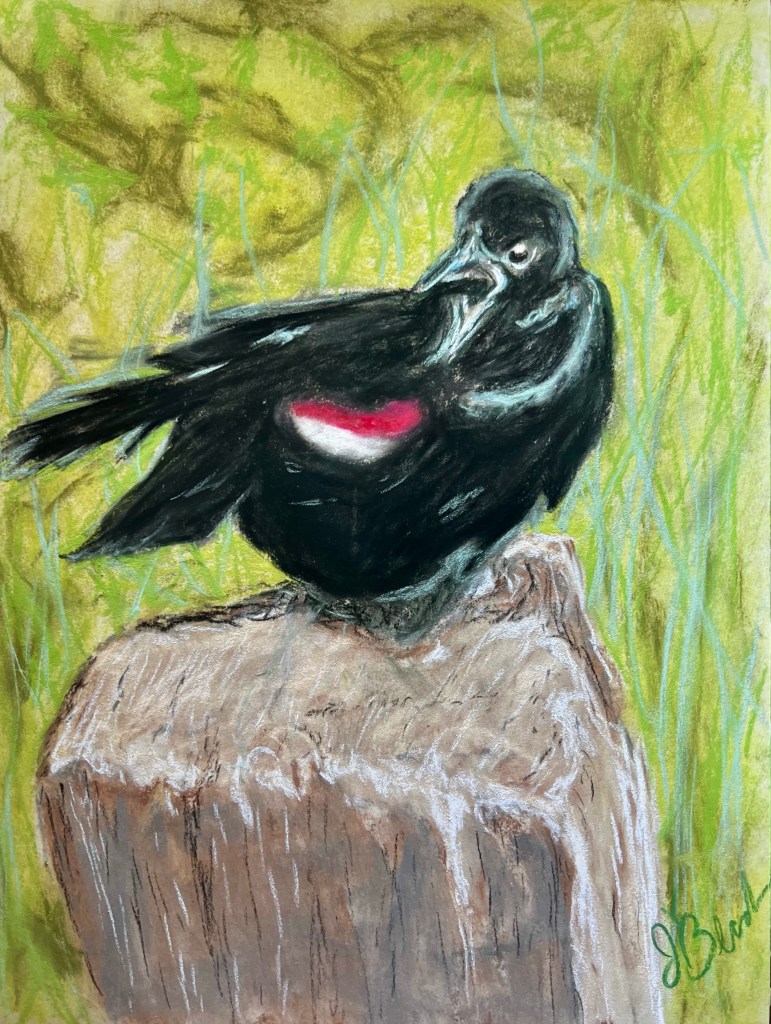 This bird, which follows the inspirational theme of the month for the Palette Club, was actually my second artwork during our two hour zoom studio time. Since I had the time for a second piece I wanted to try out soft pastel and I knew I wanted to do a bird- all my fellow artists’ bird paintings were very inspiring. I also wanted to work in pastels, since the sanded paper I ordered had arrived. At our meeting last month Vianna Szabo demonstrated soft pastels for us. I have been itching to play with pastels since. I have a ways to go before I can make the masterful pieces by Vianna, or other members of our club. But the demo gave me enough that I am happy with my red-winged blackbird. I am certainly looking forward to seeing these guys around, as they are a herald for spring weather. The robins used to be, but they have been staying year round lately- thank you, global warming.