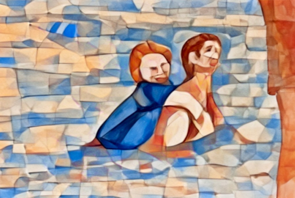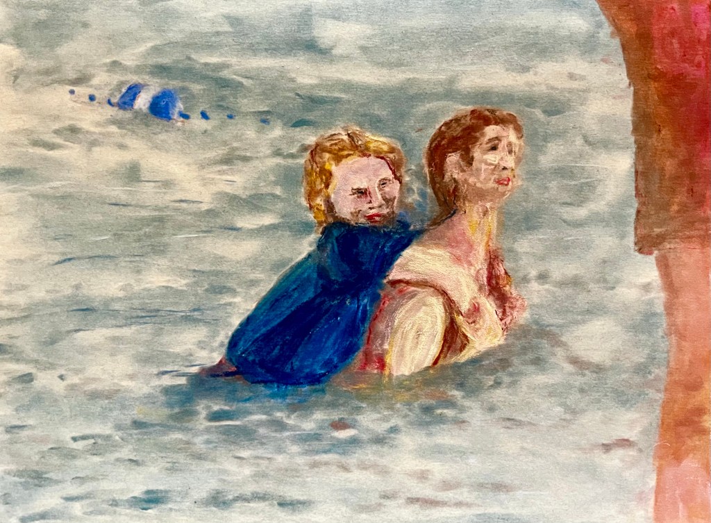 Today I spent a few hours at the studio making myself available to help our artists submit work for our upcoming show. Since no one showed up needing help, I worked on a pastel painting, this time from a photo of my kids in the pool on vacation. This was my third pastel painting, and my first of people in a non-abstract style. Once again, I think it is pretty good for me as a beginner, but there is definitely room for improvement. Practice makes progress! I still have 7 sheets left in my sanded paper pack. I’ll go back and try out the smooth pastel paper when I’ve worked through this batch. From what I read it is easier to end up with muddy colors using the non sanded paper.