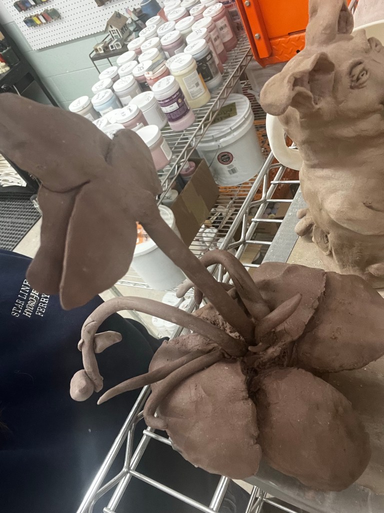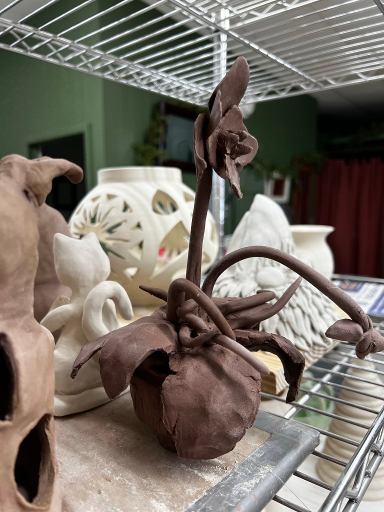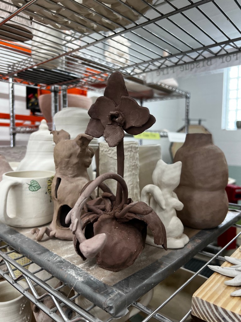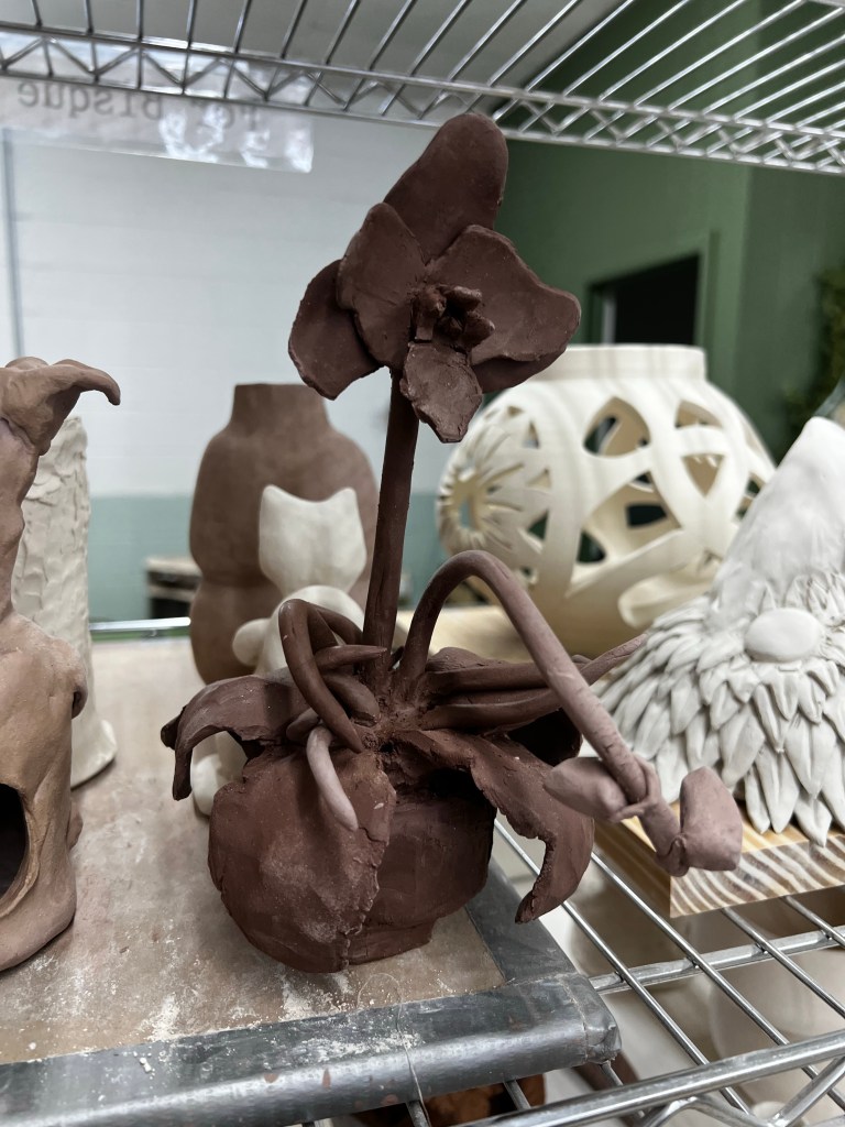 I’m quite happy with how it looks- now it just needs to stay together with two trips through the kiln. I am eager to see how it changes throughout this process. I especially thought that my big orchid flower was pretty cool.