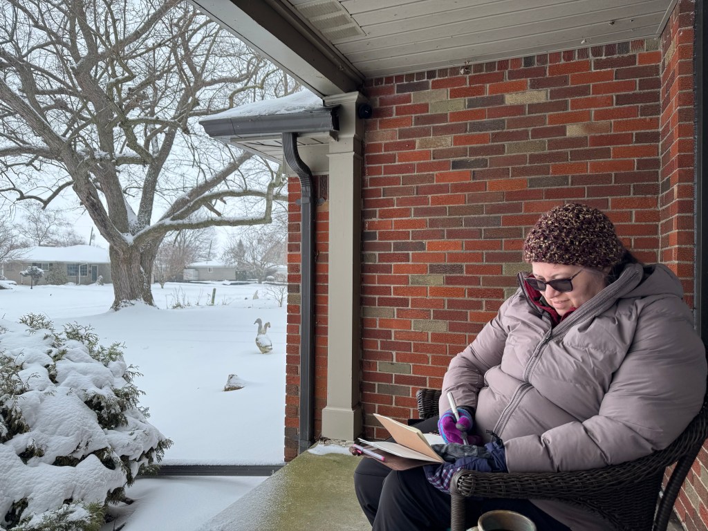 Today we had a winter paint out, but winter really asserted itself and only my mom who was hosting and I braved the snow for the event. Since it was just the two of us we sat on the covered porch to protect our paper from the falling snow.