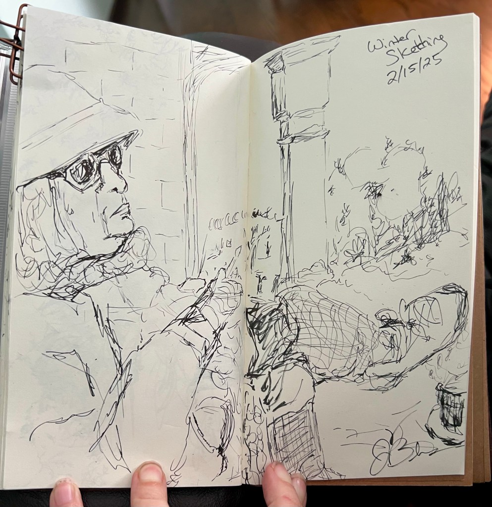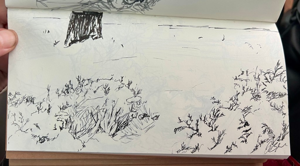 I ‘warmed’ up with a drawing of the snow covered bushes in front of me. I was using my black Japanese-made sketch pen, and it held up quite well. And the very end it seemed like the cold was starting to change the feel of it a little, but it held up remarkably well.