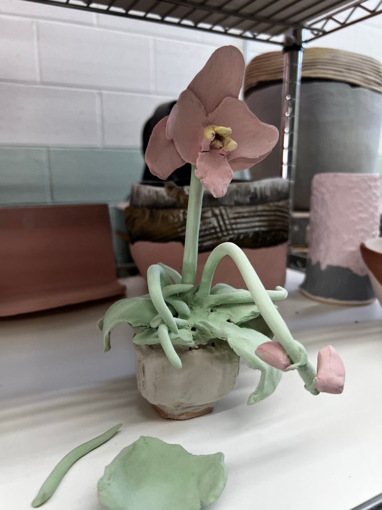My orchid sculpture survived the bisque fire nearly intact. A leaf and one of the air roots broke off, but it looks fine without them I think. I glazed them and will glue them on if needed, but I don’t anticipate needing to do so. Leaves get cut or broken in nature too. It is still not a sure thing, but I’m allowing myself to get a little excited about it now. I really didn’t think it would survive this long.