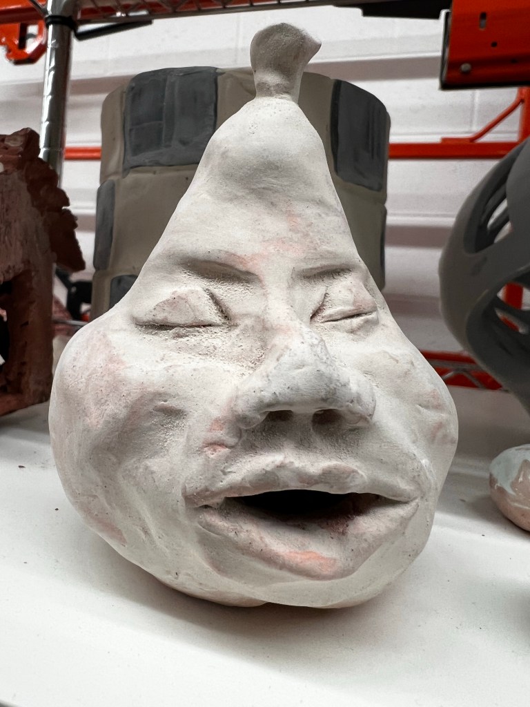 This morning was our zoom studio, but I only had a half hour to spend before taking my daughter to an appointment. I was able to start working on an owl mixed media piece, before leaving it unfinished- a perfect lead in to March’s theme of UFO: UnFinished Objects. After the appointment, I went up to the clay studio and glazed a couple sleepy pears and a sleepy mushroom. Then I started playing with the chunk of clay leftover from all the trimmings from my orchid sculpture.