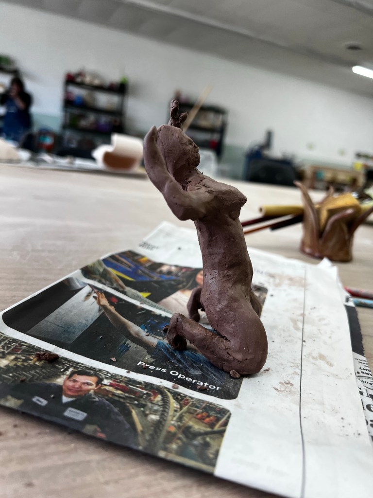 As I played a torso started to emerge. I decided to follow that through and sculpt a figure. This is something I haven’t done before and I’m excited to continue fine tuning her next visit. I’m liking how she is starting out, but I wasn’t using photo references or a model, so I’ll need to check my proportions. The head looks a little small, but I haven’t added the hair so it may just be that.