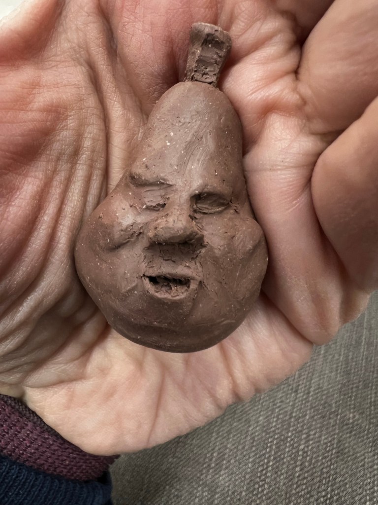 After finishing her, I decided to use up my old clay to make some small figurines. I started with a little hen. Then a duck. Then another hen. After that I decided to make a tiny pear. I wondered if I could make a small little face on it and have it turn out decent. I often struggle with carving faces on tiny things. I figured that if it didn’t work I could just smother it out and have a plain pear. I was surprised how much I loved that tiny little face.