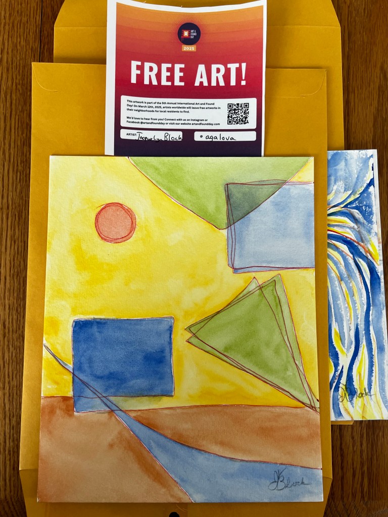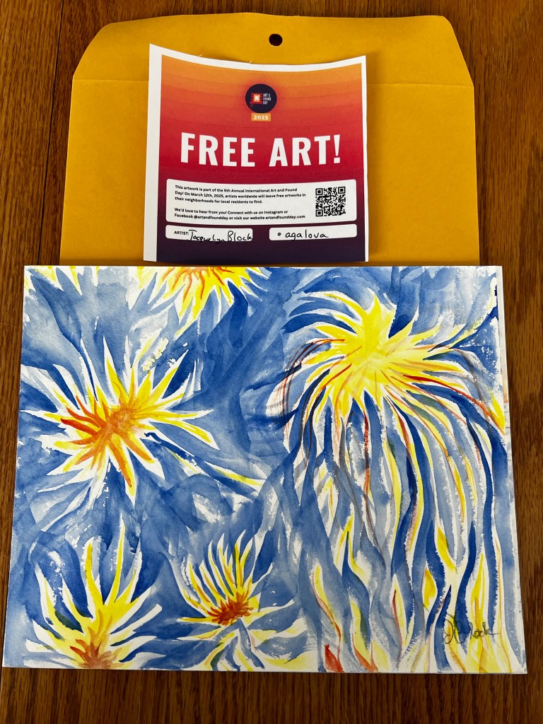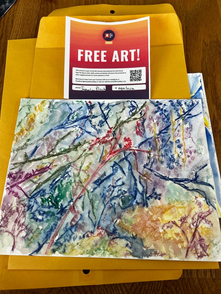 This morning I gathered a few of my paintings together and packaged them up to place around my city for Art and Found day. I participated last year with three paintings and this year have doubled that number to six. I then distributed the free art around the city in parks and public areas. At least one was picked up- about an hour after dropping it off when I walked by Gaffke Park it was no longer on the park bench.
