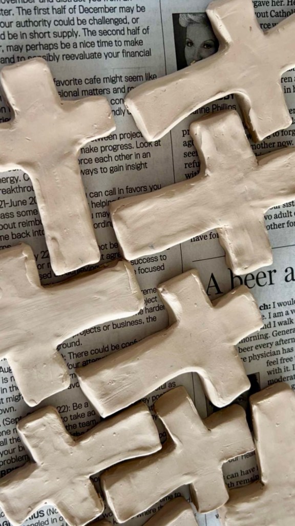 Earlier today I stopped by the clay studio for a bit to cut out some clay crosses for my religious education kids to design. They were very excited to work on this project in Clay. I’ll glaze them in their preferred colors and fire them at the studio. We don’t have our class next week for spring break so maybe they will be ready to string next class.