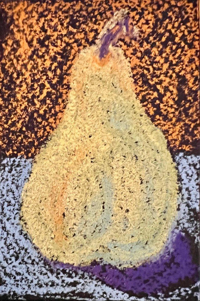 Since I had pears on my mind I knew what I’d paint to try out the pastels on the black watercolor paper. It’s a tiny painting- Artist Trading Card size.