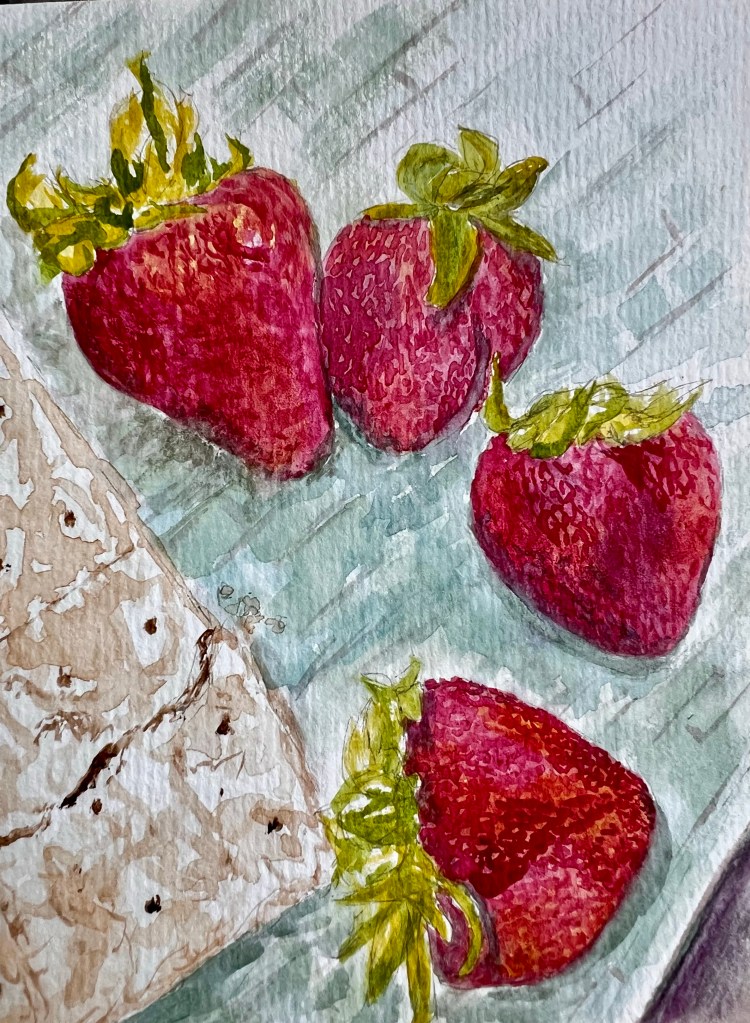 Today during our Zoom with June I started sketching out my strawberry prompt idea. I didn’t have time to get to adding the color when I logged off, as my friend arrived to pick me up. We visited the gravesite of our dear friend Brianscotte whose birthday was today. My son came too, and I read a poem I wrote for Brianscotte. It was good to have each other for mutual comfort. We all miss him terribly.