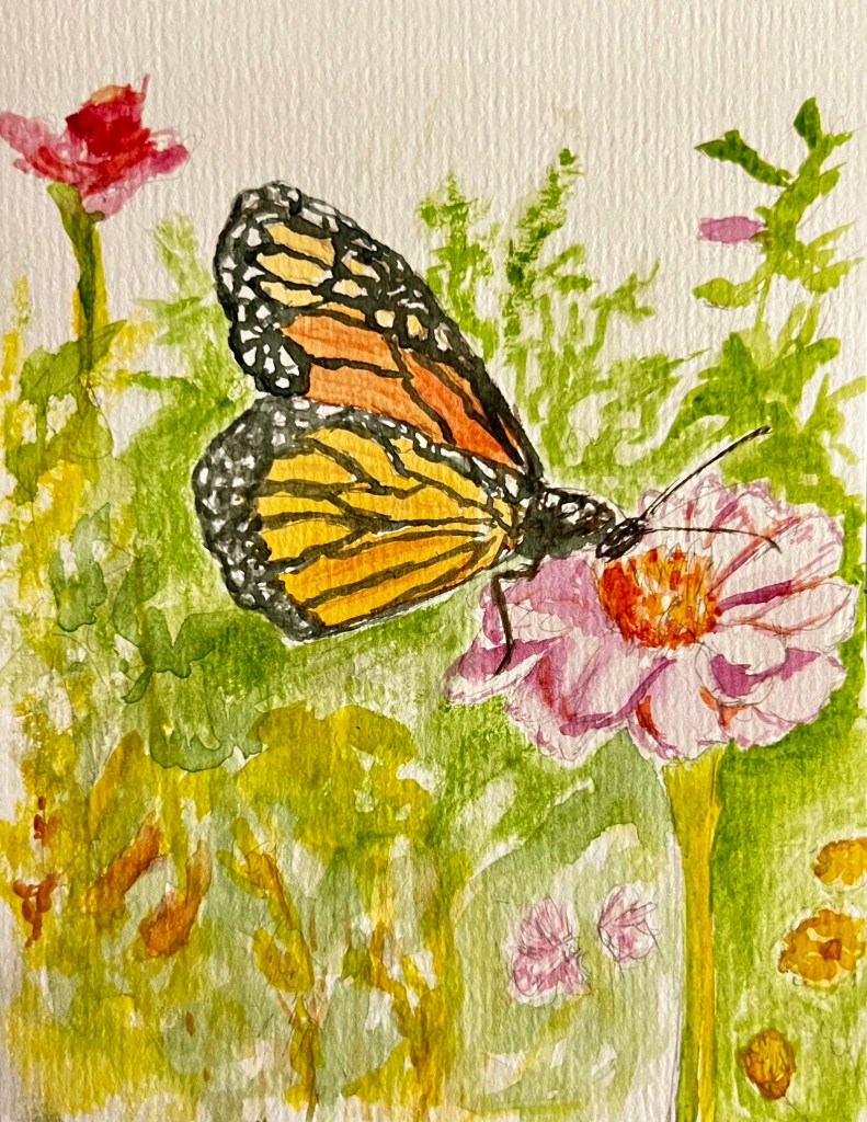 I haven’t seen a monarch butterfly yet this season- they must still be en route from Mexico. They are wonderfully photogenic, often posing for the camera. And they are fun to paint, even if painting around all those spots gets tedious.